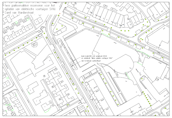 door het plaatsen van een bord volgens model E8C van bijlage 1 van het RVV 1990, een onderbord met tekst: “alleen opladen voertuigen SVVIJ”, het aanbrengen van een onderbord volgens model OB504, twee parkeervakken aan Carel van Manderstraat naast Carel van Manderstraat aanduiding dat het bord alleen geldt voor de twee aangegeven parkeerplaatsen, huisnummer 100, te reserveren voor het opladen van elektrische voertuigen;