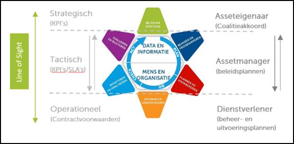 Op elk niveau worden de verschillende disciplines aangestuurd, waarbij het onderdeel Beleid vooral verantwoordelijk is voor de invulling van de integrale beleidskaders richting het beheer. Het beheerteam vertaalt dit in beheer- en uitvoeringsplannen die het onderdeel Realisatie tenslotte uitvoeren. Het toetsen van de kwaliteit met inspecties (Monitoring) wordt uitgevoerd door het beheerteam, waarna de analyse en