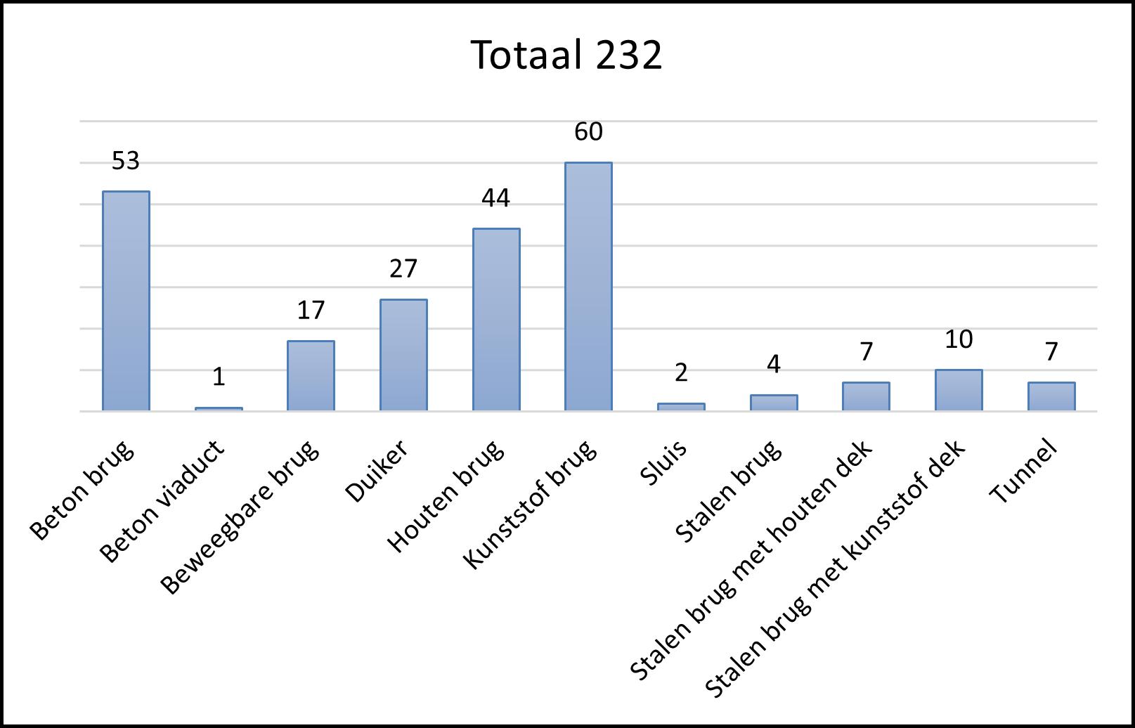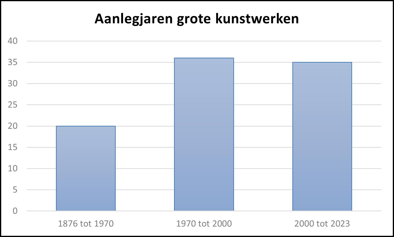 In onderstaand overzicht staan de leeftijden weergegeven van de kunstwerken. Het is beperkt tot de grote verkeersbruggen (beweegbaar & vast), viaduct en sluis. Dit omdat hier de grootste investeringen en kosten mee gemoeid gaan.