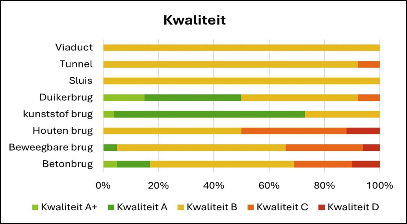 Als er gekeken wordt naar de staat per type, dan zijn de betonnen, stalen en kunststof bruggen over het algemeen in een goede staat (A), de duikers en tunnels in een redelijke tot goede staat (A en B) en de beweegbare bruggen in een (optisch) redelijke staat (B). Bij de houten bruggen verkeert circa 50% in een redelijke staat van onderhoud (B) en 50% in een matige tot slechte staat (C en D).
