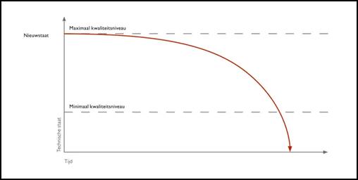In de theoretische benadering gaan wij uit van een exponentiële materiaaldegradatie. Feitelijk betekend dit dat wanneer er geen onderhoud gepleegd wordt de bouwdelen van een civiel kunstwerk steeds sneller degraderen. Als voorbeeld een betonnen brug uit de jaren 60 en 70. Het beton dat we toen gebruikten is niet het beton van nu. Er werd bijvoorbeeld veel gebruikgemaakt van versnellers om het beton sneller te laten uitharden. Dit en chloriden (zouten) zorgen nu voor wapeningscorrosie, degradatie van het beton en uiteindelijk betonrot. En voeg daarbij de steeds grotere belasting van de bruggen. Samen is dat een exponentieel proces.