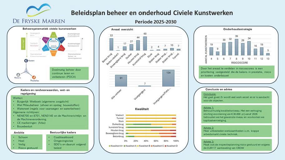 Gemeente De Fryske Marren heeft een kunstwerken areaal dat bestaat uit 232 objecten. De vervangingswaarde is circa 35 miljoen euro exclusief VAT kosten. (VAT is voorbereiding, advies en toezicht). Betreffende de algemene staat van de kunstwerken kunnen we stellen, dat er de voorgaande jaren (2020 t/m 2023) een inhaalslag gepleegd is om de veiligheid en functionaliteit van de kunstwerken te waarborgen. Het gevolg van deze inhaalslag is nu zichtbaar, want de grote hoeveelheid in het verleden geconstateerde achterstallige onderhoud is uitgevoerd. Maar de opgave blijft onverminderd groot. Veel kunstwerken lopen richting einde levensduur en zijn aangelegd in een tijd van minder zwaar verkeer. Het overschrijden van de beoogde levensduur van een kunstwerk in combinatie met een steeds intensiever gebruik, vergroot de kans op het uiteindelijk bezwijken van de constructie. Om de veiligheid van gebruikers en de schakels in de infrastructuur te borgen moeten we kunstwerken tijdig versterken of vervangen. Ook zijn nieuwe actualiteiten zoals duurzaamheid, ambities en doelstellingen aanleiding voor een nieuw beleidsplan.