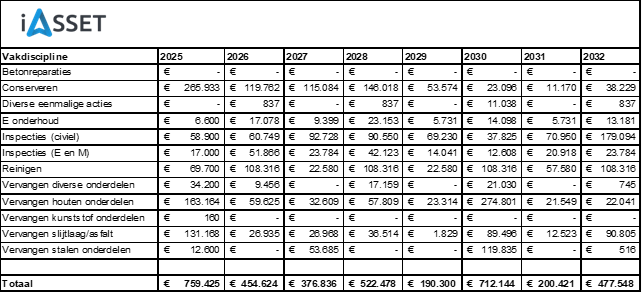 Voor het berekenen van de kosten groot onderhoud gebruiken we het beheersysteem iASSET. In deze applicatie koppelen we onderhoudsmaatregelen aan een eenheidsprijs. Net als bij de exploitatiebudgetten volgen we bij de indexering de CBS GWW inputprijsindex. Volgens deze indexering is vanaf 2026 een extra dotatie nodig van € 30.000 per jaar. De geactualiseerde meerjaren onderhoudsprognose en het verloop van de voorziening 2022 - 2032 is weergegeven in bijlage 2. Eventueel extra benodigd budget wordt verantwoord in de Voorjaarsrapportage 2025.