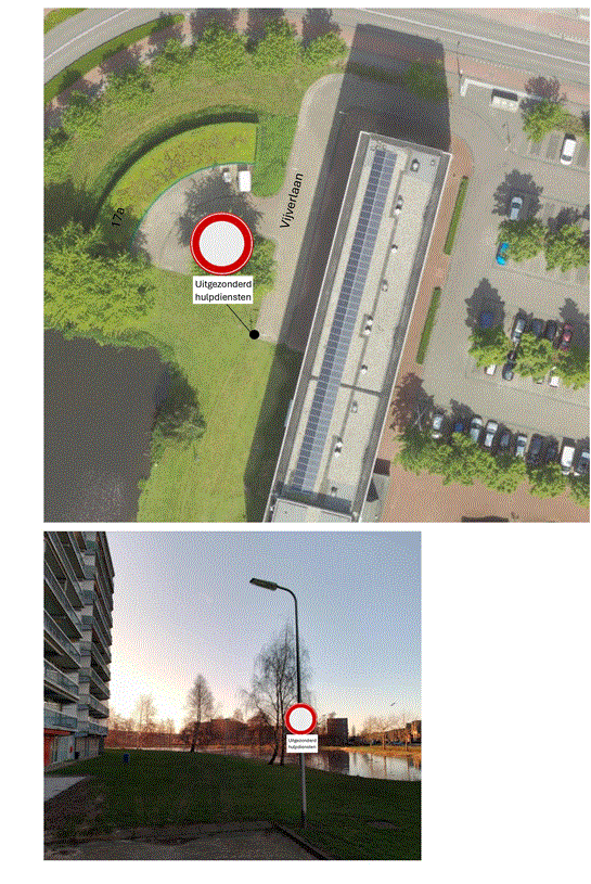om de bestaande verkeersborden G11 te vervangen voor C01 met onderbord ‘uitgezonderd hulpdiensten’ bij het calamiteitenpad nabij Vijverlaan 17;