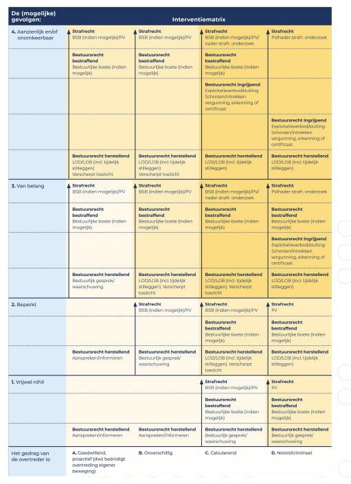 Bij het optreden met behulp van de interventiematrix zetten we in beginsel het minst ingrijpende instrument in, gericht op herstel of om herhaling van de overtreding te voorkomen. Zwaardere instrumenten zetten we snel in als de overtreding voortduurt of zich herhaalt.