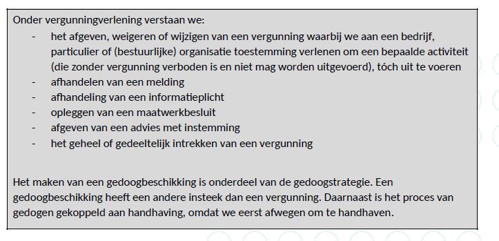 beleidsuitgangspunten. Als uitgangspunt nemen we de concept Landelijke vergunningen strategie (LVS-2017). We stellen heldere, transparante en handhaafbare vergunningen op en verlenen ze binnen de gestelde termijn. Initiatiefnemers hebben een eigen verantwoordelijkheid om aan hun verplichtingen te voldoen. Bij initiatieven waar meerdere vergunningen of toestemmingen voor nodig zijn, stemmen we zoveel mogelijk af met andere bevoegde overheden en omgevingsdiensten.