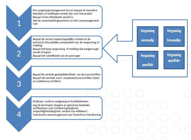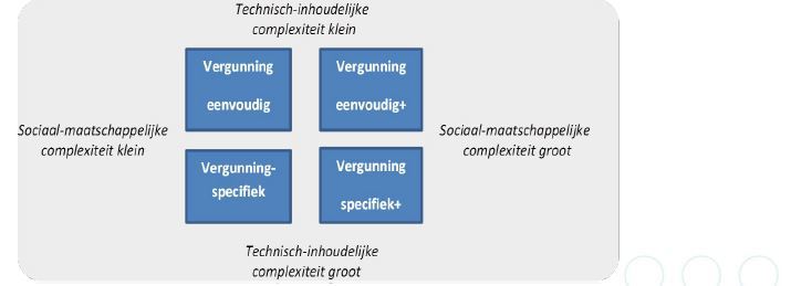 Figuur: Vier typen vergunningen, afhankelijk van de technisch-inhoudelijke en sociaalmaatschappelijke complexiteit van het project, de inrichting of activiteit en/of het gebied waarin de inrichting is gevestigd of de activiteit plaatsvindt.