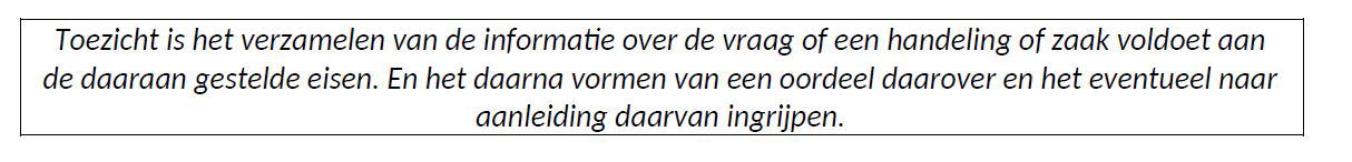 Samengevat: onder toezicht verstaan we het controleren of en in hoeverre burgers, bedrijven of instellingen regels naleven.