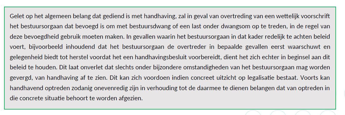 “Gelet op het algemeen belang dat gediend is met handhaving, zal in geval van overtreding van een wettelijk voorschrift het bestuursorgaan dat bevoegd is om met bestuursdwang of een last onder dwangsom op te treden, in de regel van deze bevoegdheid gebruik moeten maken. Slechts onder bijzondere omstandigheden mag van het bestuursorgaan worden gevergd dit niet te doen. Dit kan zich voordoen indien concreet uitzicht op legalisatie bestaat. Voorts kan handhavend optreden zodanig onevenredig zijn in verhouding tot de daarmee te dienen belangen, dat van optreden in de concrete situatie behoort te worden afgezien”. 17