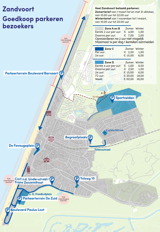 Zone A en Zone B: € 4,00 per uur voor de eerste 2 uur en € 7,00 per uur voor elk daaropvolgend uur, op alle openbaar toegankelijke wegen of weggedeelten die vallen binnen de gemeentegrenzen van de gemeente Zandvoort met uitzondering van Bentveld, zoals aangegeven met een grijze arcering op kaart A in bijlage 2, met uitzondering van de straten en/of gebieden zoals genoemd onder 2 en 3.