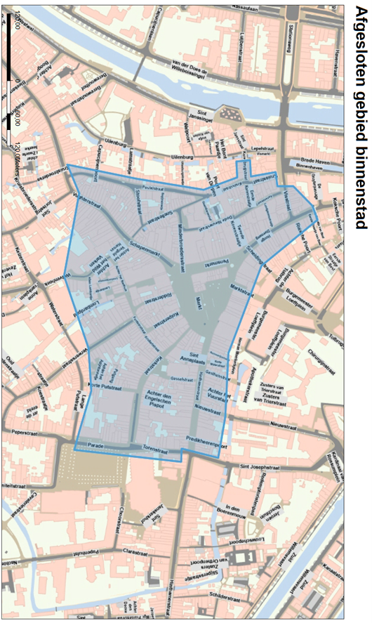 Geslotenverklaring Binnenstad: het autoluwe gebied gelegen achter de pollers en piramides zoals aangegeven op het bij dit reglement als bijlage behorende tekening.
