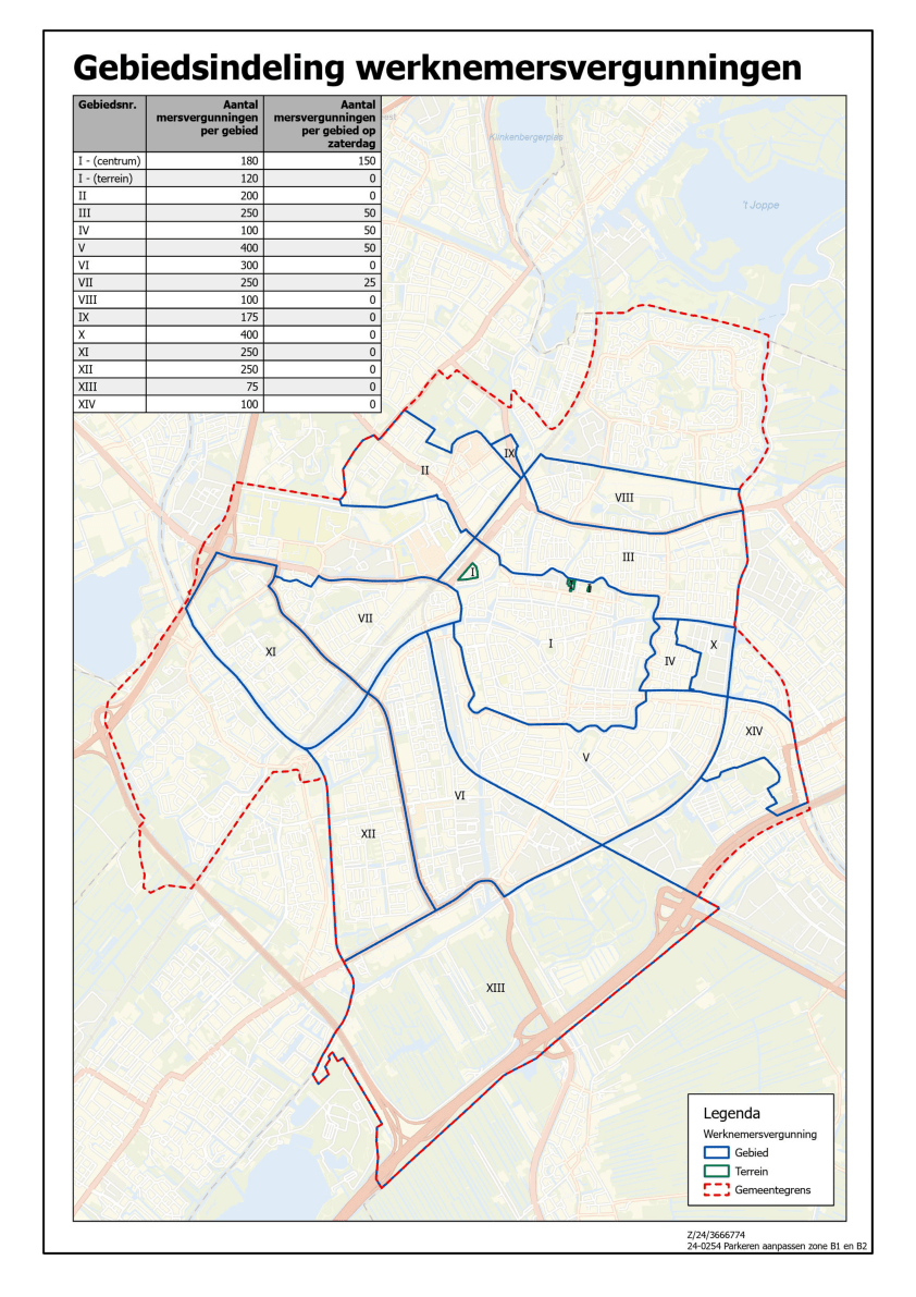 Werknemersparkeervergunningen worden verleend op basis van de gebiedsindeling (gebied I t/m X) zoals aangegeven op de bij dit besluit behorende kaart Z/24/3666774 in bijlage I.
