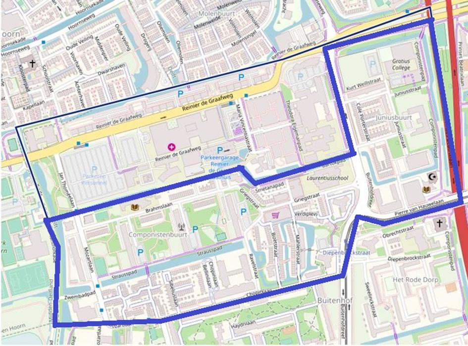 Afbakende straten/wegen: Het water tussen de Brahmslaan en het Reinier de Graaf Gasthuis -> Buitenhofdreef -> Westlandseweg -> Prinses Beatrixlaan -> Pierre van Hauwelaan -> Chopinlaan-> Mozartlaan -> Tanthofkade
