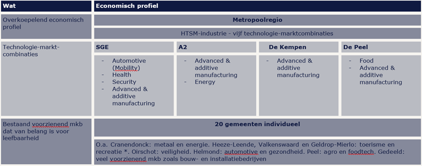 Voor optimaal gebruik van ruimte, talent en het ecosysteem kiest de MRE om de focus op HTSM aan te houden en de subregio’s daarbinnen ruimte te geven om accenten aan te brengen. Bestaande bedrijvigheid binnen deze ecosystemen is vaak al gelieerd aan de HTSM-sector of is ondersteunend aan bedrijven die zich binnen dit speelveld bewegen. Lokaal moet voldoende ruimte zijn om het mkb een plek te geven, ook het mkb dat niet binnen het economisch profiel valt, maar wel voorzienend is voor de regio.