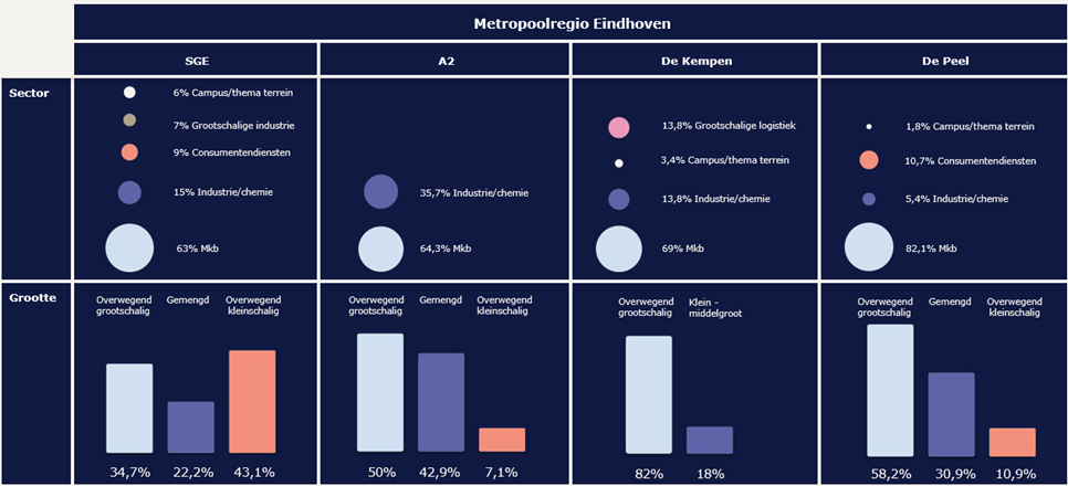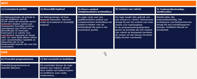 Metropoolregio zet primair in op het faciliteren van de HTSM-sector als stuwende sector. Subregio’s bieden ruimte op (bestaande) kansrijke sectoren (gerelateerd aan HTSM) voor diversificatie en innovatie. Daarnaast is er ruimte voor voorzienend regionaal en lokaal mkb. De regio biedt alleen ruimte voor (grootschalige) logistiek en datacentra als ze van toegevoegde waarde zijn voor het ecosysteem.