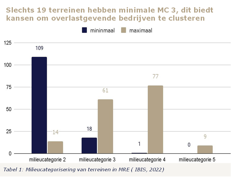 Op meer dan de helft van de bedrijventerreinen binnen de MRE geldt een maximale milieucategorie. Tegelijkertijd hebben slechts negentien bedrijventerreinen een minimale milieucategorie. Dit kan in praktijk betekenen dat bijvoorbeeld een sportschool zich bevindt in de nabijheid van een circulaire afvalverwerker op een terrein met maximaal categorie 5. Je wilt de ruimte van de sportschool eigenlijk benutten voor een bedrijf dat zich alleen kan vestigen op een plek met milieucategorie 5. Een sportschool kan zich vestigen op een terrein met een lagere milieucategorie.