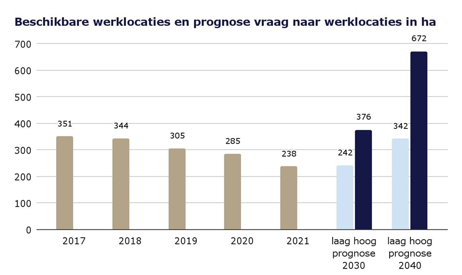 De beschikbare ruimte in de MRE toont een neerwaartse trend en is niet toereikend voor prognoses van de provincie. Hierbij plaatsen we de voetnoot dat deze prognoses de totale vraag weergeven en niet enkel de vraag binnen het economisch profiel. De prognose van de provincie toont tot 2030 een ruimtevraag van 242 tot 376 hectare. De provincie vraagt de regio in ieder geval uit te gaan van het lage scenario tot 242 ha en daarnaast rekening te houden met de ruimtevraag die na 2030 wordt voorzien.