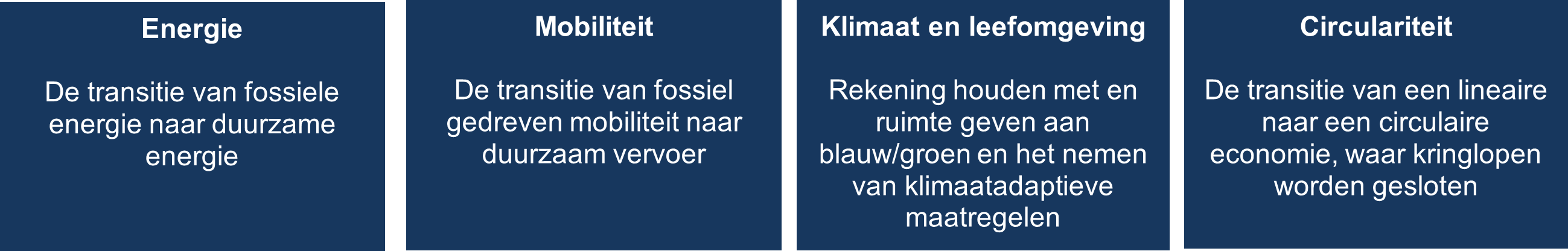 Digitale transformatie: ook de digitale transformatie kent een impact op de ruimte. Naast dat de digitale infrastructuur gefaciliteerd moet worden op bedrijventerreinen (dit hangt tevens nauw samen met de transitieopgave Energie), kent ook de veranderende bedrijvigheid en ruimtebehoefte een ruimtelijke impact. Denk hierbij aan logistieke centra waar vanuit online bestellingen worden verspreid.