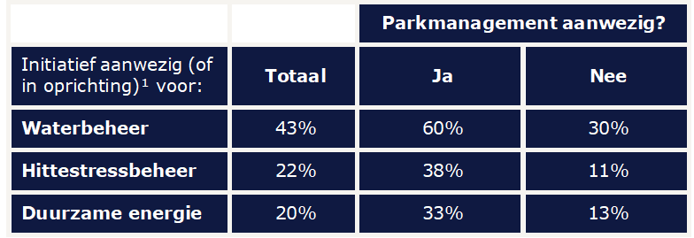 Op de meeste terreinen is geen initiatief aanwezig rondom waterbeheer, hittestress of duurzame energie (figuur 1). Juist bedrijventerreinen zijn vaak compleet verhard en daarmee gevoelig voor hittestress en wateroverlast bij hevige regenval. Op bedrijventerreinen waar parkmanagement aanwezig is zijn vaker initiatieven aanwezig die bijdragen aan toekomstbestendige terreinen. Op dit moment heeft slechts 35% van de terreinen parkmanagement. Wanneer de regio inzet op het actief stimuleren van een georganiseerd bedrijfsleven op bedrijventerreinen, zal dit naar verwachting bijdragen aan de toekomstbestendigheid van deze terreinen. Naast collectieve organisatie is ook de beschikbaarheid van kapitaal van belang.