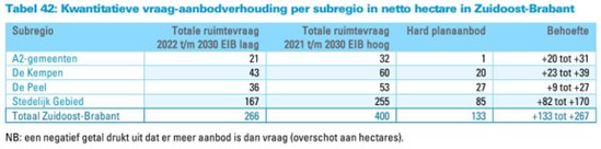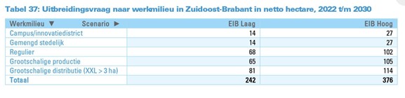 Gedeputeerde Staten van de provincie vragen alle gemeenten in Noord-Brabant om voor het einde van 2023 regionale programma’s voor de werklocaties op te stellen. Zij stellen daarbij voor om minimaal op het niveau van EIB-laag-scenario te programmeren en bovendien al rekening te houden met de ruimtevraag die na 2030 wordt voorzien. Rechts is de tabel uit de onderliggende prognose bedrijventerreinen tot 2030 opgenomen en een tabel met daarin de uitbreidingsvraag per type werkmileu.