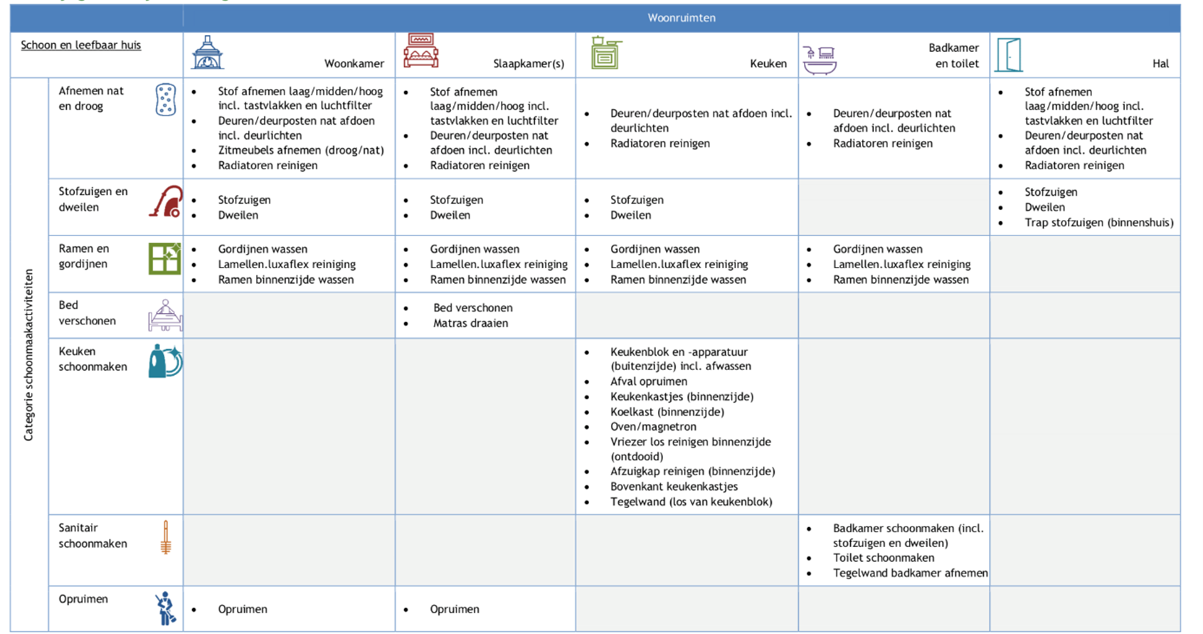 Een schoon en leefbaar huis wil niet zeggen dat de in gebruik zijnde vertrekken standaard wekelijks schoon moeten worden gemaakt. De frequentie van schoon maken is mede afhankelijk van de persoonlijke situatie en leefwijze (gezinssamenstelling en gezondheid). Dat betekent dus maatwerk: geen situatie is hetzelfde.