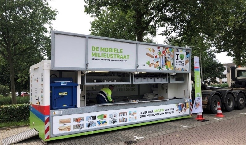 Om te voorkomen dat inwoners klein grofvuil bij het restafval aanbieden, ontwikkelen we een zogenaamde mobiele milieustraat (zie voorbeeld op foto) waar onze inwoners hun klein grofvuil gratis kunnen aanbieden. Deze mobiele milieustraat staat één keer per maand gedurende een dagdeel op een druk bezochte plek, zoals bijvoorbeeld de weekmarkt. Voor de hele gemeente gaan we uit van 20 verschillende locaties. De mobiele milieustraat heeft een functie als laagdrempelig brengpunt en is ook een plek waar we inwoners verder kunnen informeren over het voorkomen van afval, afvalscheiding en recycling. Bij de mobiele milieustraat leveren inwoners de spullen in die niet in de grondstofcontainers in de wijk horen. Bijvoorbeeld harde kunststoffen, piepschuim, kleine hoeveelheden hout. De definitieve lijst van in te leveren spullen/stromen laten we mede afhangen van de behoefte van onze inwoners. Uitgangspunt is dat de spullen in een grote boodschappentas passen. Hiermee voorkomen we dat inwoners grote hoeveelheden aanbieden; hiervoor is immers de milieustraat bedoeld.
