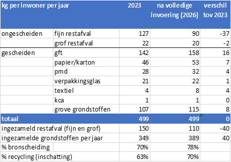 In ieder geval blijkt duidelijk uit deze tabel dat er aanvullende maatregelen nodig zijn om de hoeveelheid afval en restafval in de beleidsperiode 2025-2030 nog verder te verminderen tot ons ambitieniveau (< 90 kg in 2028 en < 50 kg in 2030):