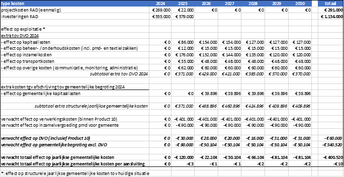 We moeten kosten maken om de maatregelen voor te bereiden en in te voeren; totaal € 291.000. Dit zijn eenmalige projectkosten, onder andere voor communicatie en projectleiding. Voor zover belastingtechnisch mogelijk heeft RAD eenmalige kosten als investering opgenomen, zodat deze door de jaren heen gelijkmatig kunnen worden afgeschreven. De resterende eenmalige projectkosten (zie tabel) schrijven we als gemeente over 10 jaar af; de kapitaallasten die daaruit voortkomen zijn in de tabel meegenomen onder de post ‘effect op gemeentelijke kapitaallasten’..