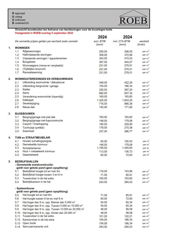 Wanneer de aanneemsom ontbreekt, of onvolledig is aangeleverd nadat de aanvrager in de gelegenheid is gesteld om het gebrek te herstellen, worden de bouwkosten bepaald door te toetsen aan de laatste vastgestelde versie van de ROEB-lijst (zie bijlage: Overzicht bouwkosten ten behoeve van berekeningen van de bouwlegestoets, van het Regionaal Overleg Eindhoven Bouwtoezicht).