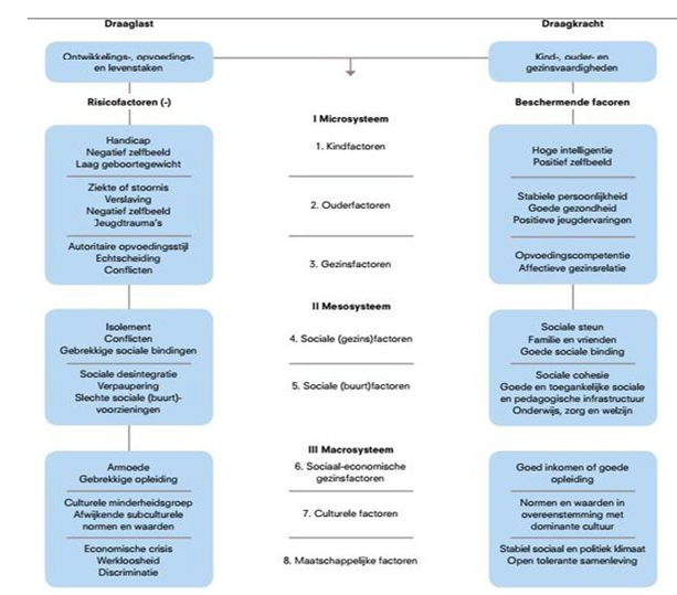 De aanwezigheid van een enkele risicofactor zal weinig invloed hebben op de kwaliteit van de opvoeding en ontwikkeling van jeugdigen. Ieder individu krijgt immers te maken met bepaalde risicofactoren. Er ontstaan problemen als de risicofactoren zich opstapelen en de beschermende factoren niet. Als er veel risicofactoren aanwezig zijn in een gezinssituatie en weinig beschermende factoren kunnen de kind-, ouder- en gezinsvaardigheden de risicofactoren die tot uiting komen niet meer opvangen met hun draagkracht. Op dat moment is de verhouding tussen draagkracht en draaglast uit balans. De verhouding tussen draagkracht en draaglast bepaalt of de ouder(s) de opvoeding daadwerkelijk ‘aankan/aankunnen’ of dat de verhouding uit balans is (Bakker e.a., 1998) (zie volgende pagina).