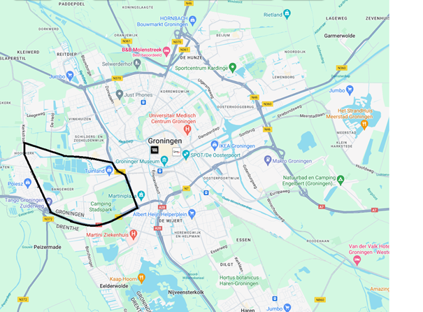 Route vanaf de Kerklaan in Haren naar de Vismarkt in Groningen
