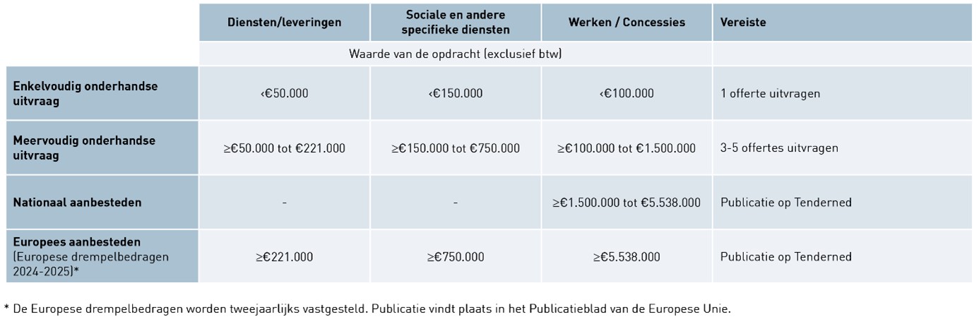 De gemeente Almere heeft de vrijheid om zelf zorg te dragen voor haar taken. Zij maakt daarbij de keuze om taken zelf uit te voeren, met partijen samen te werken of om in te kopen. Kiest Almere voor een inkooptraject dan gelden afhankelijk van de opdrachtwaarde drempelbedragen. Voor onderstaand schema geldt dat het is toegestaan een proportionele inkoopprocedure van een hogere orde te kiezen.