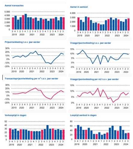 Inmiddels zien we dat de woningmarkt na een korte, maar heftige ‘dip’ in 2022/2023 weer sterk is aangetrokken, met name door de stagnerende of licht dalende hypotheekrente en de sterk gestegen lonen. Het aanbod in de regio is ten opzichte van een jaar geleden gestegen met 10%, waarbij de verschillen tussen de woningtypen fors zijn. Daarnaast zijn de totale transactieprijzen en de transactieprijzen per m² in het 3e kwartaal van 2024 flink hoger dan het jaar daarvoor (gemiddeld met 14,1% en 10,2%). 1 Ten opzichte van het kwartaal ervoor zijn de prijzen echter gedaald, terwijl de prijs per m² iets is gestegen.