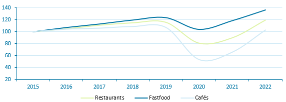 De horecasector groeit al enige jaren. Steeds vaker geniet de consument buitenshuis van eten en drinken. Er is een verschuiving merkbaar in de balans tussen werk en vrije tijd: mensen mogen meer en moeten minder. Dit geeft een positieve impuls aan de sector. Bovendien gaan jongere generaties vaker uit eten. Zo gaan millennials (1981-2000) drie keer zo vaak uit eten dan babyboomers (voor 1960) doen4 . Onderstaand figuur geeft de volumeontwikkeling van de horecasector weer. Na twee zware jaren tijdens de coronapandemie kent de horeca momenteel een sterk herstel. Het herstel van de sector getuigt van veerkracht en aanpassingsvermogen. Er is sprake van landelijke stijging in de verkopen en bestedingen, met de fastfood-branche als koploper. Steeds meer consumenten kiezen voor snelle en gemakkelijke maaltijden. Ook de restaurantsector ontwikkelt zich positief. Cafés blijven achter.