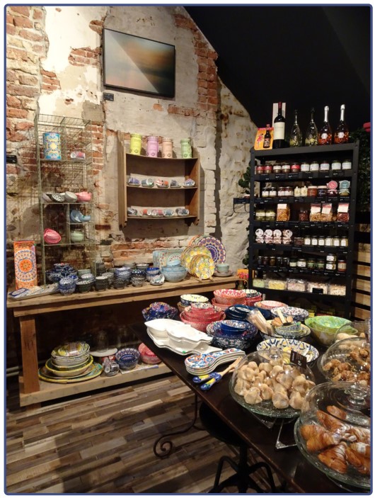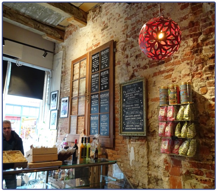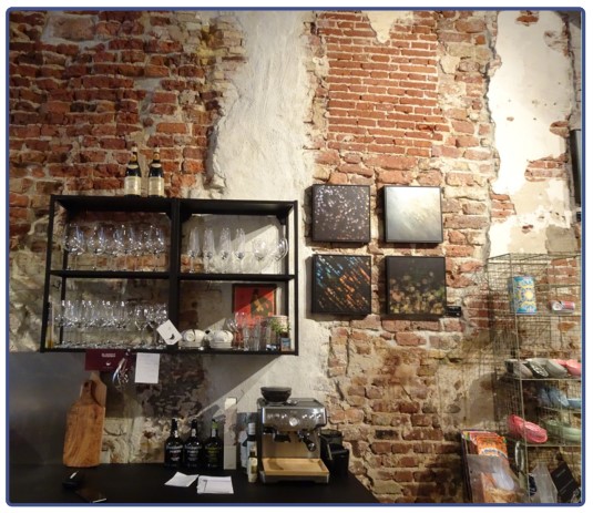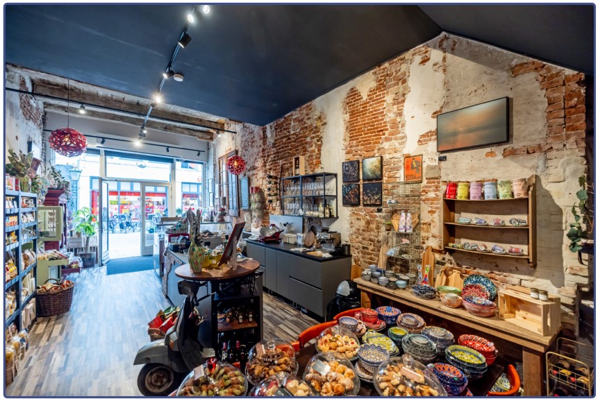 De unieke binnenkant van het pand wordt versterkt door de gekozen inrichting. De oude muur is op vele plekken in het pand nog steeds zichtbaar en beleefbaar. Het geeft karakter aan de winkel. Ook de plafondconstructie is door de eigenaar van het pand weer beleefbaar gemaakt.