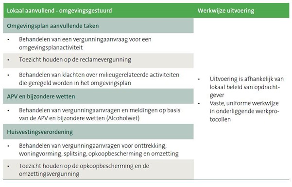 Zowel voor het behandelen van aanvragen, als het uitvoeren van toezicht, op grond van het omgevingsplan geldt dat de diepgang van uitvoering afhankelijk is van het lokale beleid. In dit geval het omgevingsplan van de opdrachtgever. Wel streeft OZHZ naar een uniforme werkwijze in bijbehorende werkprotocollen.