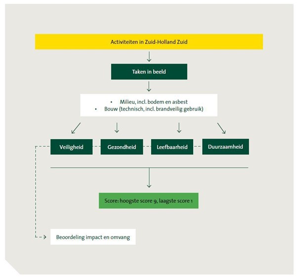 Per activiteit kijken we naar de wettelijke taken die de gemeente heeft om de risico’s bij de activiteit te beperken. Wat gaat er mis als de die taak niet of onvoldoende wordt uitgevoerd? Het antwoord op deze vraag bepaalt de score in het risicomodel. Hoe groter het negatief effect, des te hoger staat de taak op de prioriteitenlijst. Bij OZHZ gaat het in de kern om taken op het gebied van milieu, bestaande bouw en brandveilig gebruik.