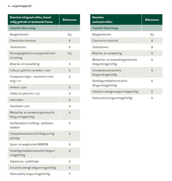 Bij de hoogste risicoklasse gaat het om branches met een risicoscore van 6 of hoger voor milieu of brandveilig gebruik, aangevuld met de bedrijven met een lagere risicoscore die op basis van het Besluit Activiteiten Leefomgeving vergunningplichtig zijn.