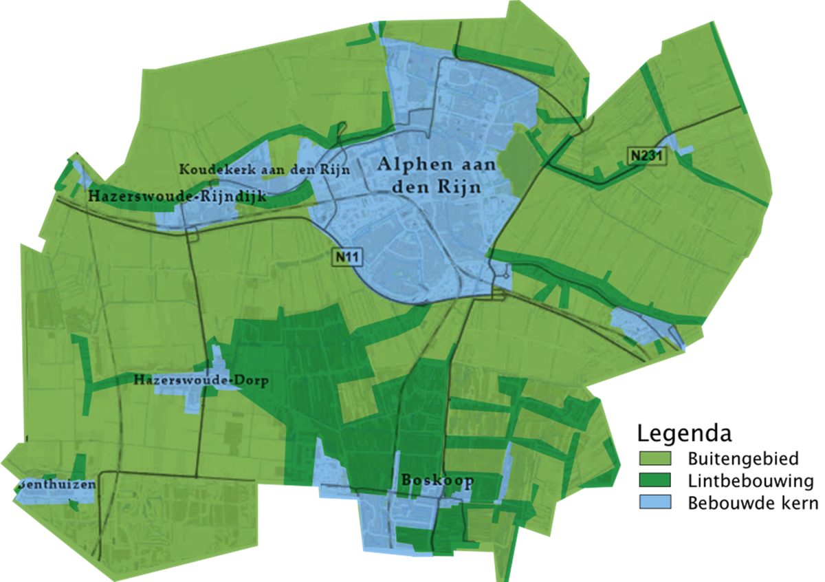 De bebouwde kern kenmerkt zich door een hoge dichtheid van bebouwing. De bebouwde kern komt grofweg overeen met de provinciale kaart voor bestaand dorps- en stadsgezicht. De gemeente kent de bebouwde kernen; Alphen aan den Rijn, Aarlanderveen, Benthuizen, Boskoop, Hazerswoude-Dorp, Hazerswoude-Rijndijk, Hazerswoude-Rijndijk (Groenendijk), Koudekerk aan den Rijn en Zwammerdam. De bebouwde kern valt niet samen met de juridische bebouwde kom. Door grootschalige nieuwbouw in het buitengebied of ter plaatse van lintbebouwing kan de bebouwde kern uitbreiden.