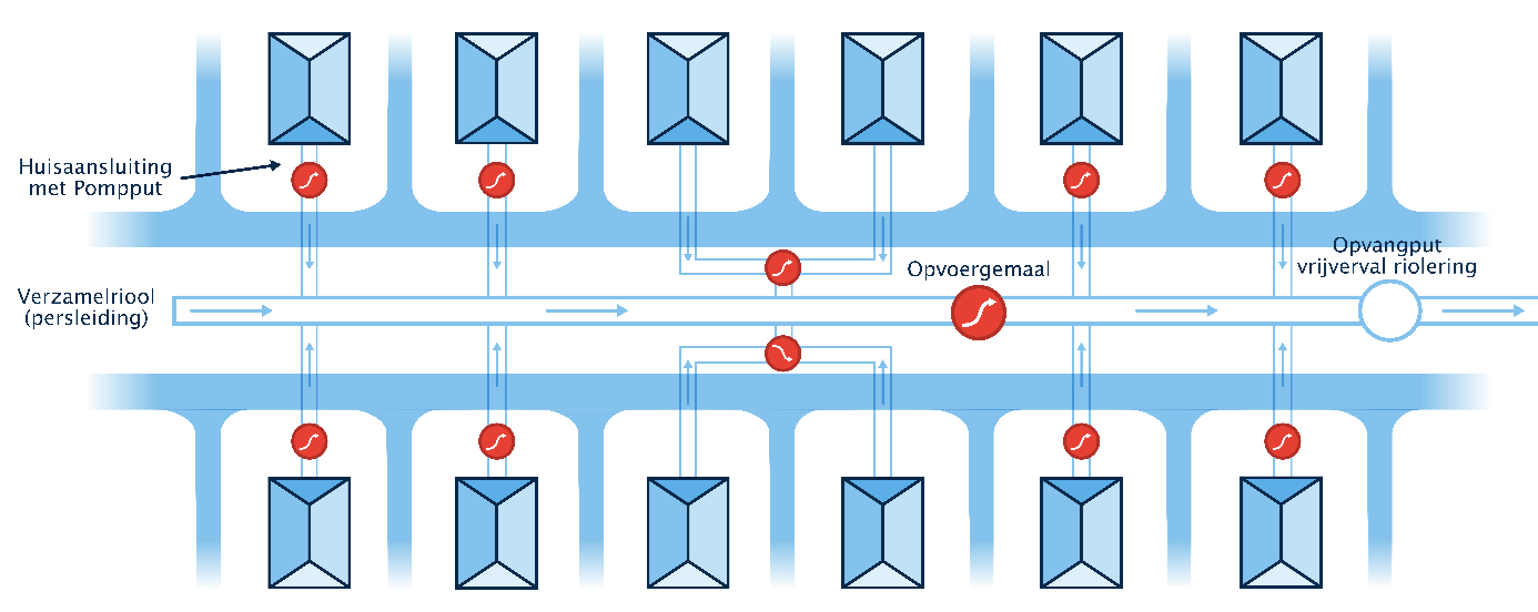 Bij lintbebouwing buiten de kernen met verspreide bebouwing en grote transportafstanden ligt vaak drukriool. Drukriool vervoert door middel van minigemalen en opvoergemalen stedelijk afvalwater (figuur I). Vanwege de beperkte capaciteit is drukriool uitsluitend geschikt voor afvoer van vuil stedelijk afvalwater. De gemeente staat lozen van grond- of hemelwater op het drukriool niet toe. De gemeente heeft het meeste drukriool aangelegd tijdens de ‘verfijningsregeling’ (1980-1990) en ‘sanering lozingen buitengebied’ (2000-2010).