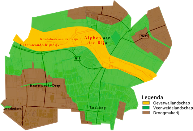 Binnen de gemeente Alphen aan den Rijn komen grofweg drie landschapsvormen voor: oeverwallandschap, veenweidelandschap en droogmakerij (figuur 3). In figuur 4 werken we de kenmerken, risico’s en kansen per landschapsvorm uit. De grens tussen het veenweidelandschap en de droogmakerij is scherp en valt samen met de poldergrenzen. De grens tussen het oeverwallenlandschap en het veenweidelandschap is niet scherp en loopt geleidelijk over.