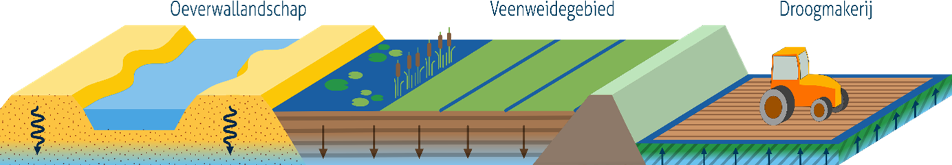 In het veenweidelandschap heeft op enkele locaties sinds de Middeleeuwen turfwinning plaatsgevonden. Door het weghalen van de bovenste meters veen, ontstonden veenplassen. Vanaf de 17e eeuw zijn deze plassen drooggemalen en zijn hier droogmakerijen ontstaan. De droogmakerijen hebben een stabiele kleiige bodem en bevinden zich enkele meters onder de zeespiegel (NAP).