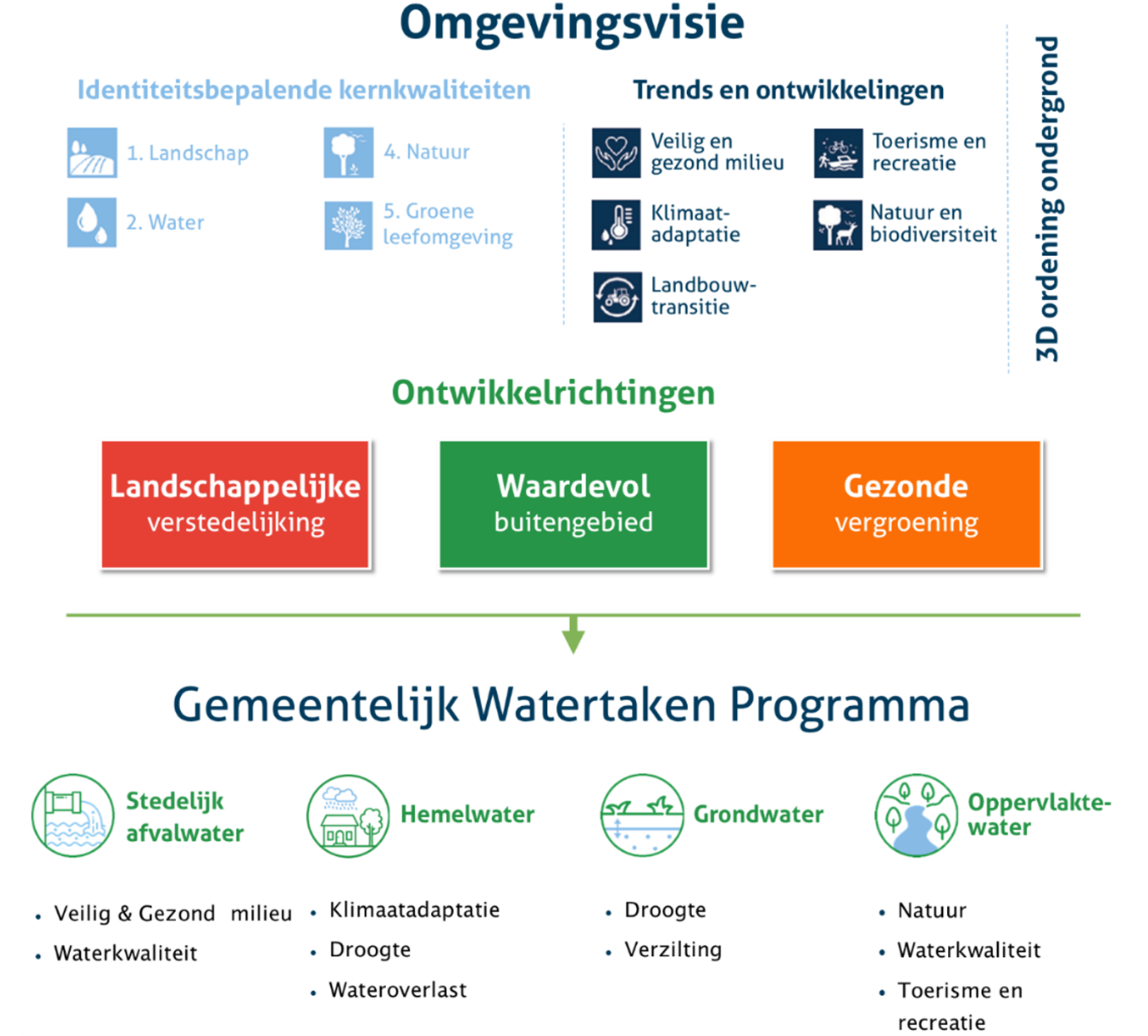 De ontwikkelrichtingen Landschappelijke Verstedelijking, Waardevol Buitengebied en Gezonde Vergroening hangen sterk samen met de gemeentelijke watertaken. De ontwikkelingsrichting Landschappelijke Verstedelijking omvat de thema’s: wateroverlast, veilig en gezond milieu. Waardevol Buitengebied omvat de thema’s: waterkwaliteit, verzilting, landbouwtransitie, toerisme en recreatie en natuur en biodiversiteit. Gezonde Vergroening omvat de thema’s: natuur en biodiversiteit, wateroverlast en droogte.