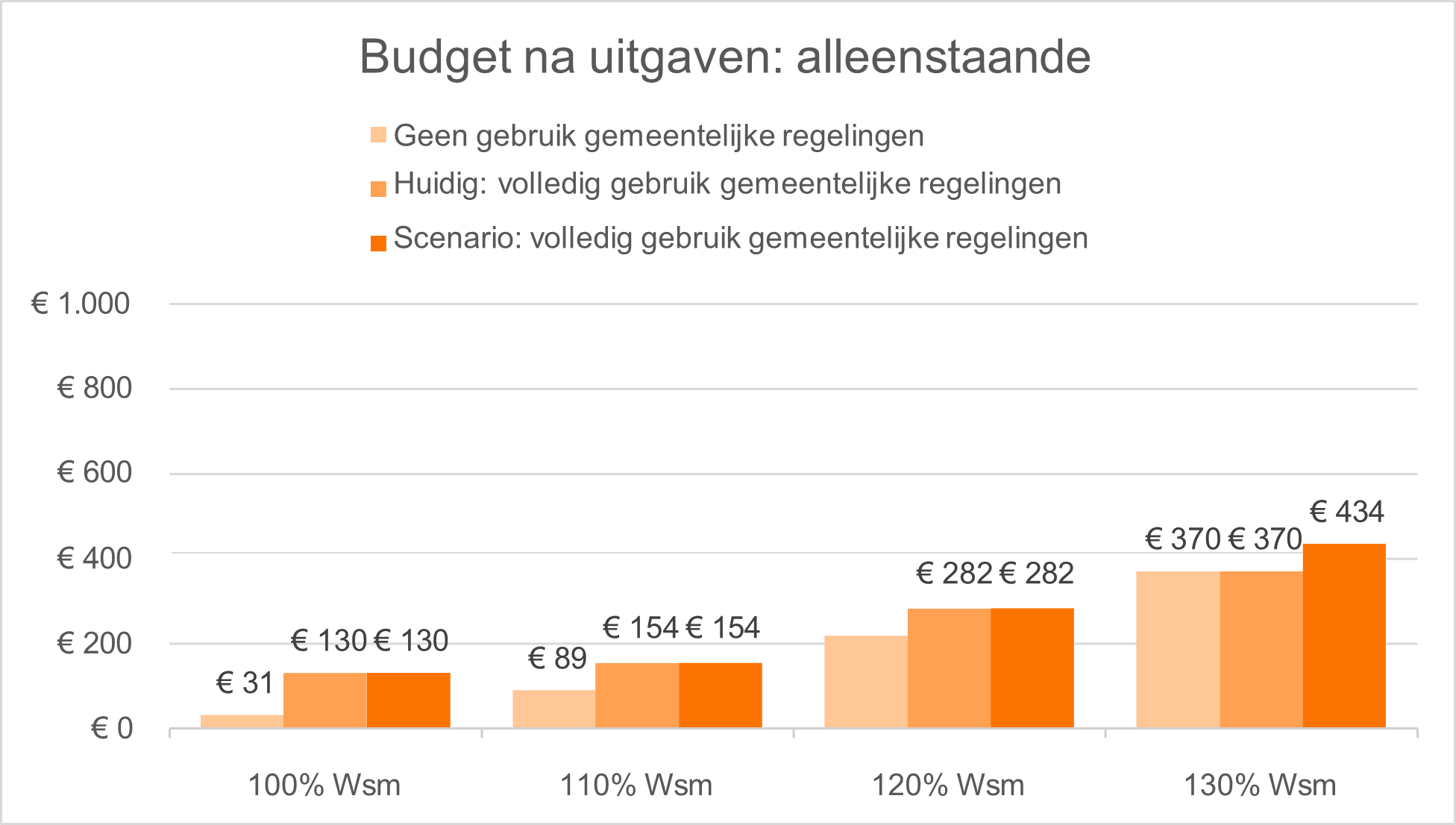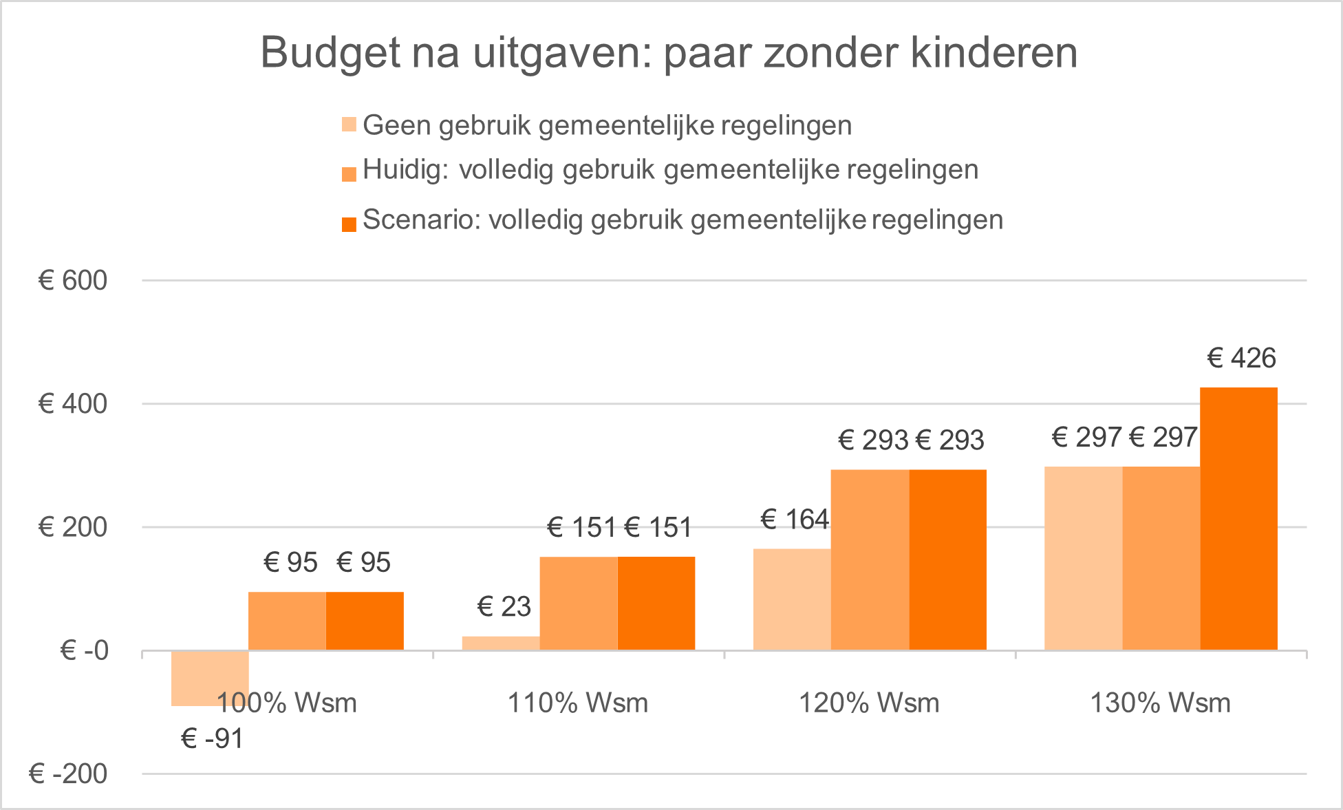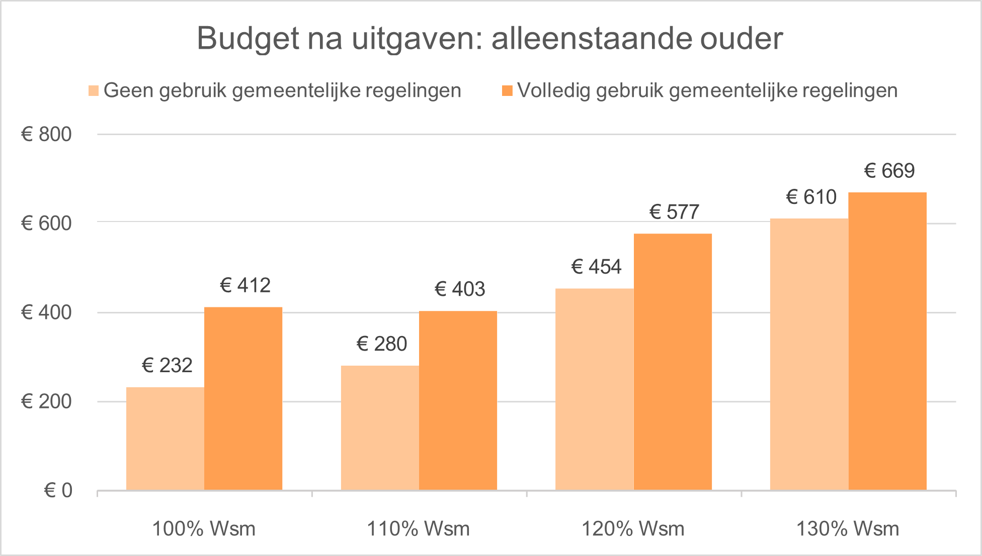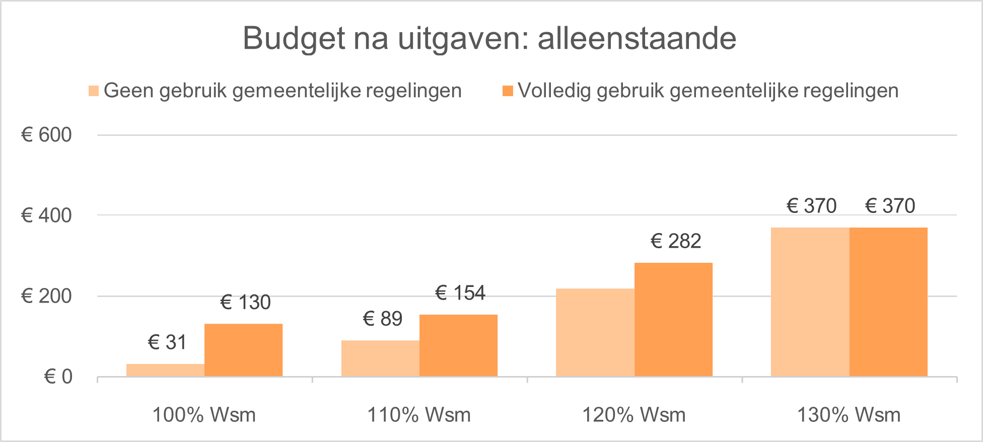 Ondanks het feit dat de doelgroep die in aanmerking komt voor de Participatieregeling 18+ en Collectieve ziektekostenverzekering logischerwijs groter wordt wanneer de inkomensgrens wijzigt en je daardoor een grotere groep inwoners kunt ondersteunen, zien we dat de groep inkomens tussen 120 en 130% gemiddeld al voldoende over houdt (van circa € 279 tot € 669 per maand bij volledig gebruik van gemeentelijke regelingen).