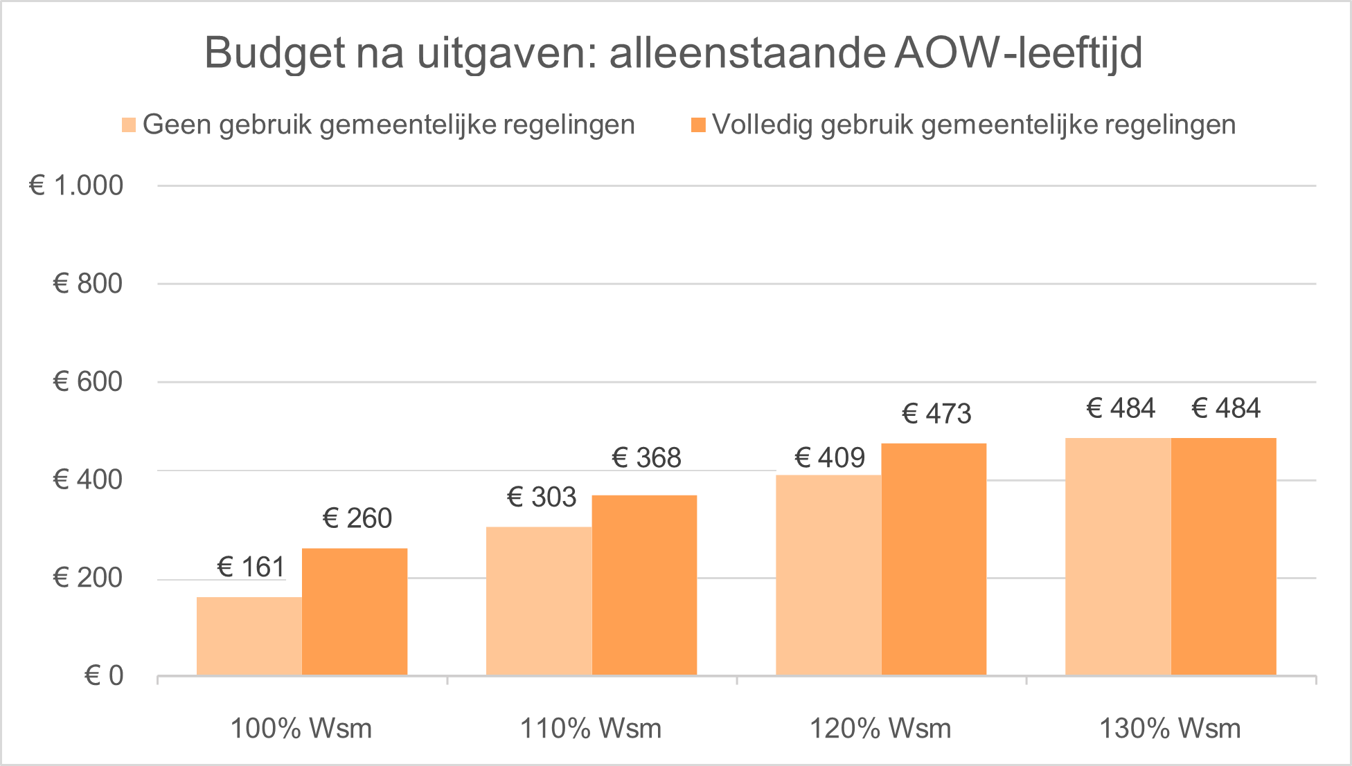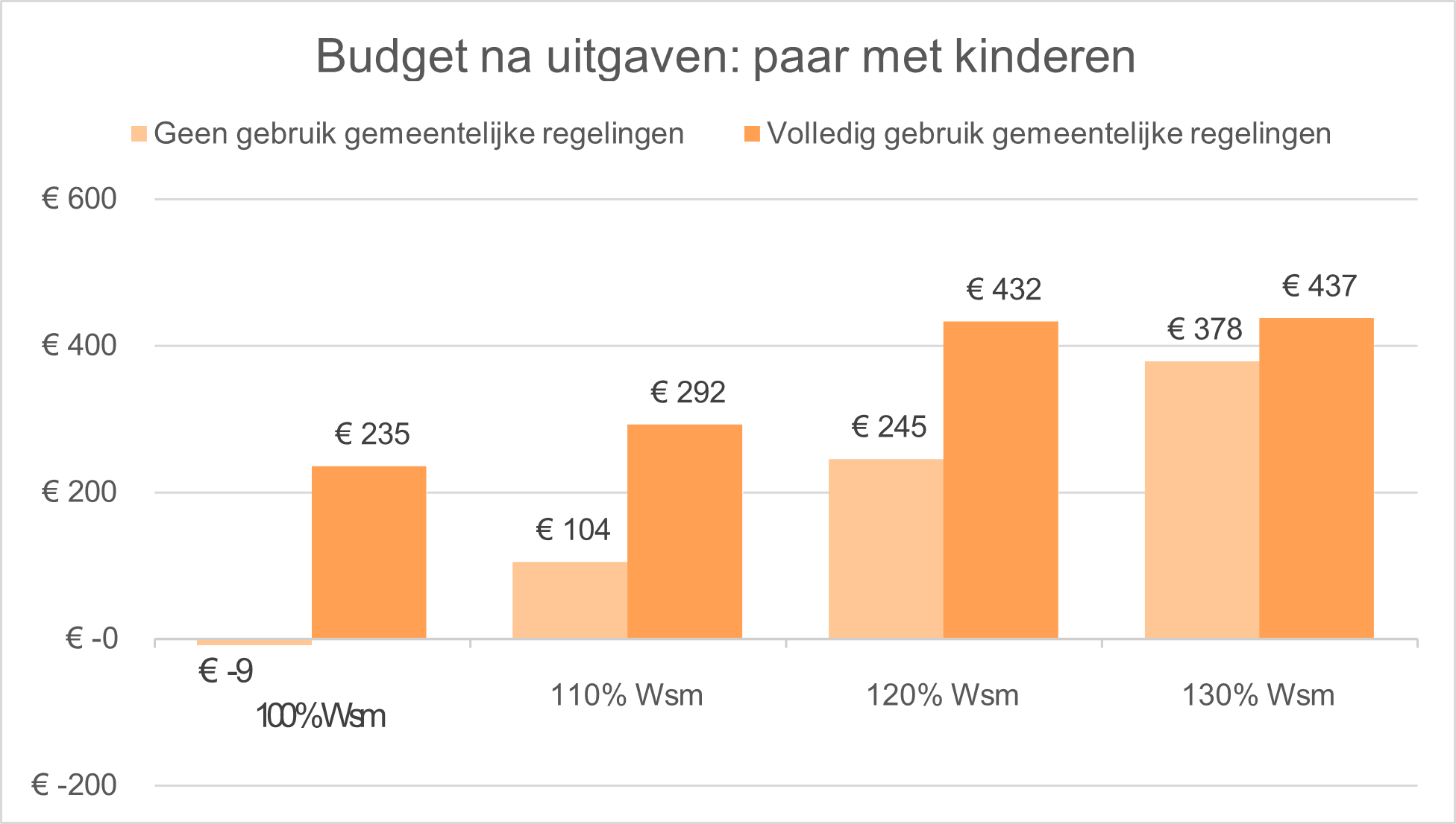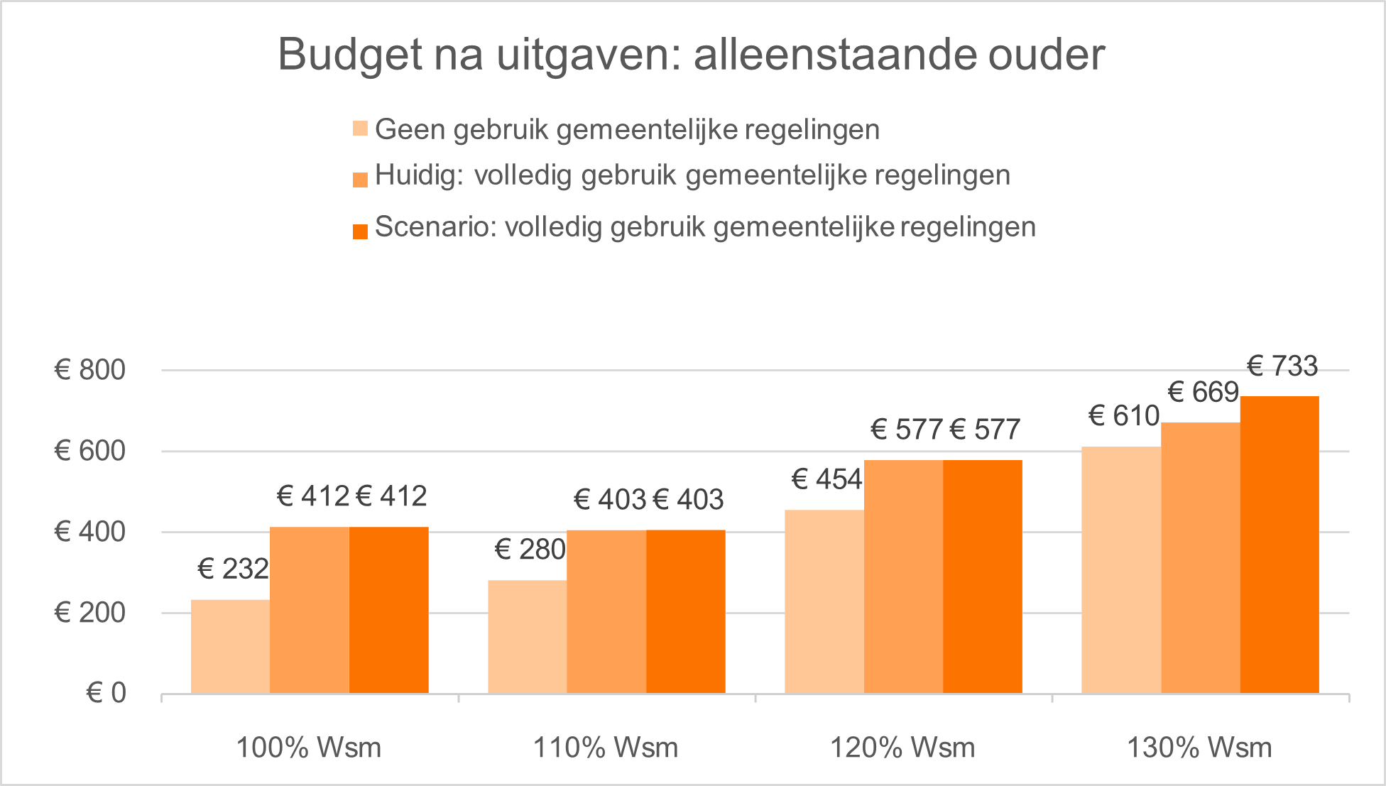 Ondanks het feit dat de doelgroep die in aanmerking komt voor de Participatieregeling 18+ en Collectieve ziektekostenverzekering logischerwijs groter wordt wanneer de inkomensgrens wijzigt en je daardoor een grotere groep inwoners kunt ondersteunen, zien we dat de groep inkomens tussen 120 en 130% gemiddeld al voldoende over houdt (van circa € 279 tot € 669 per maand bij volledig gebruik van gemeentelijke regelingen).
