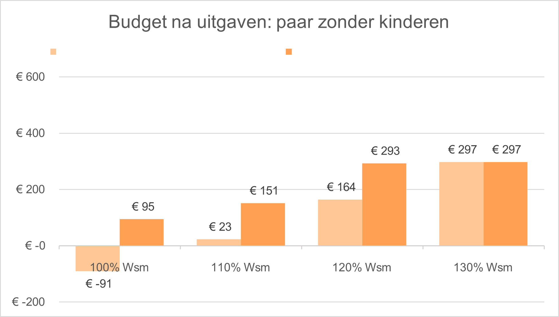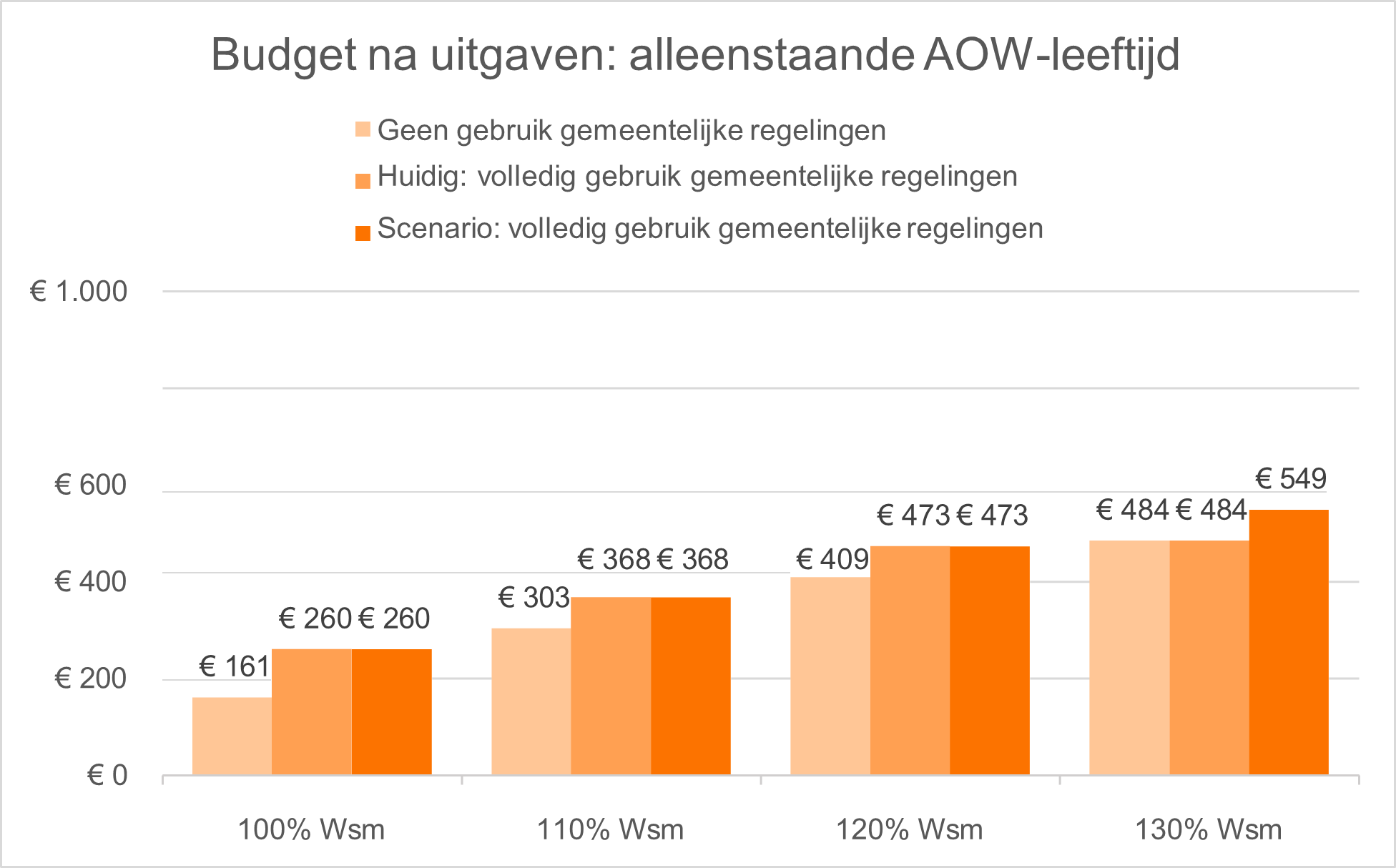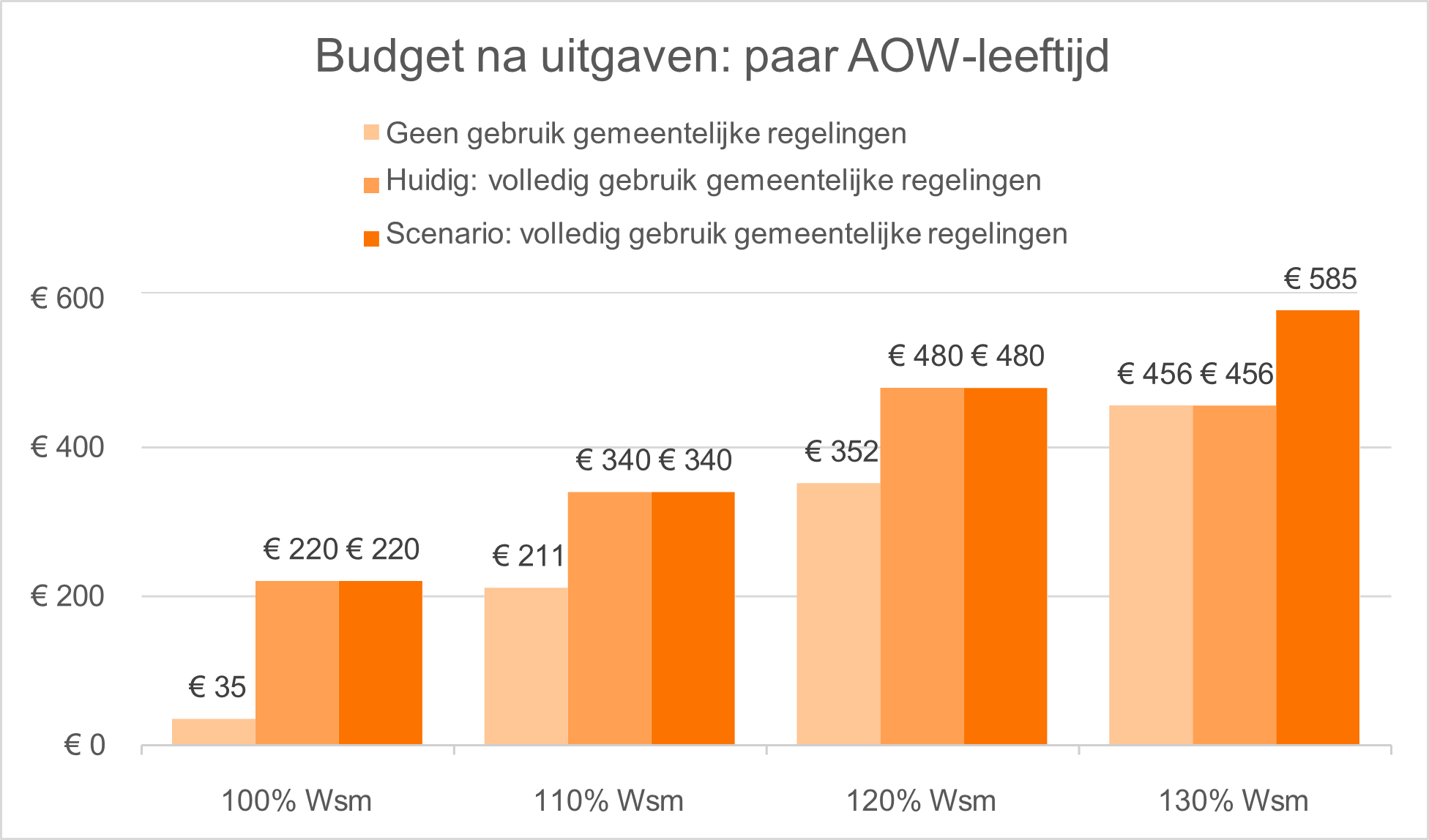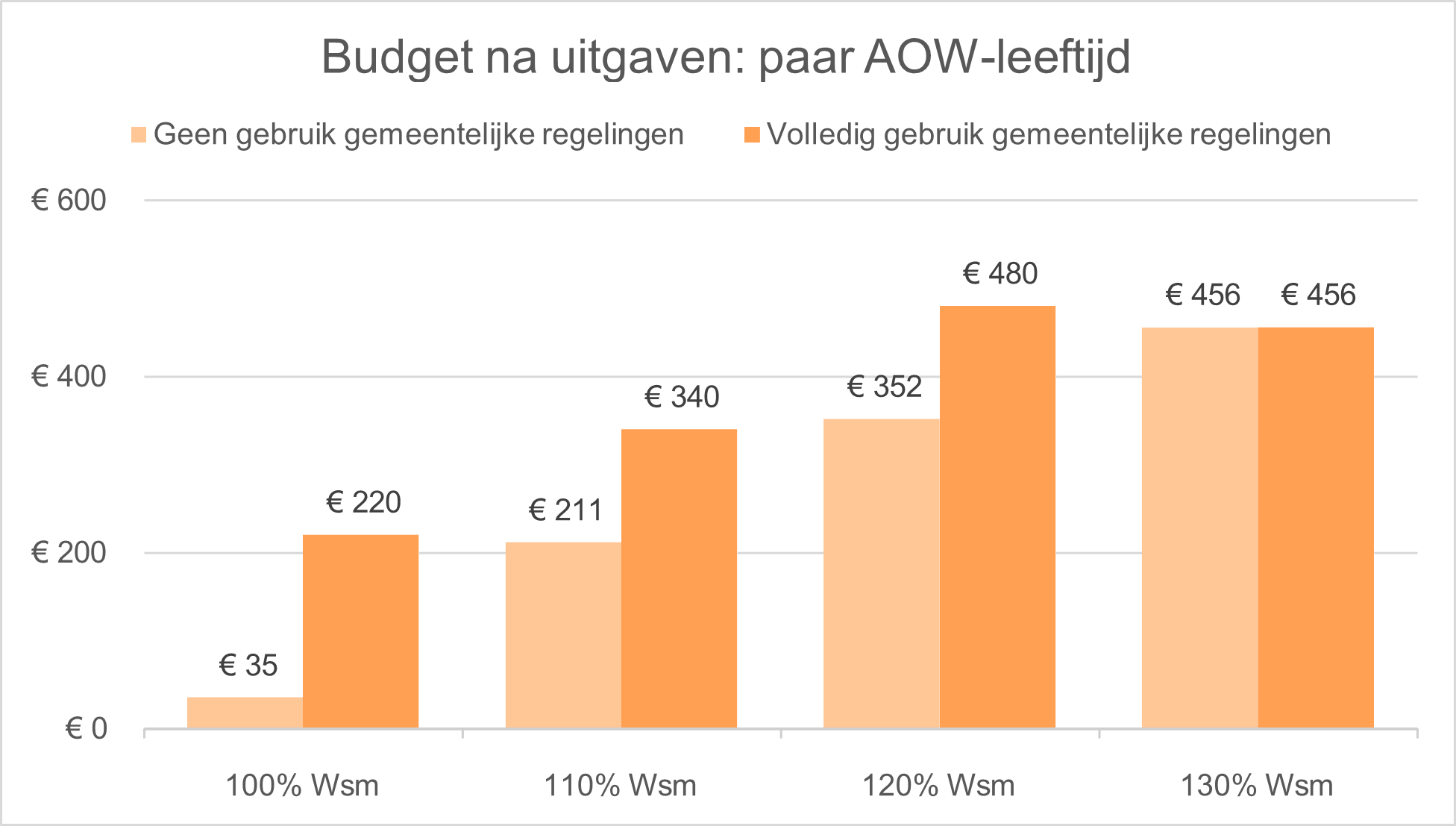 Ondanks het feit dat de doelgroep die in aanmerking komt voor de Participatieregeling 18+ en Collectieve ziektekostenverzekering logischerwijs groter wordt wanneer de inkomensgrens wijzigt en je daardoor een grotere groep inwoners kunt ondersteunen, zien we dat de groep inkomens tussen 120 en 130% gemiddeld al voldoende over houdt (van circa € 279 tot € 669 per maand bij volledig gebruik van gemeentelijke regelingen).