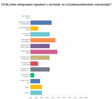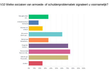 Ten eerste geven de respondenten aan dat armoede- en schuldenproblematiek eigenlijk bij elke doelgroep wel voorkomt. Iets waar de gemeente zich in zou willen verdiepen is of onze partners echt bij iedereen armoede zien en of we dan kunnen concluderen dat we geen doelgroepenbeleid moeten voeren. Ook geven de respondenten verschillende oorzaken aan van armoede- en schuldenproblematiek. Persoonlijke factoren (denk aan chronische ziekten en psychische problemen) spelen een grote rol, maar ook stijgende kosten, gebrek aan financieel inzicht en life events (denk aan echtscheidingen, overlijden, pensioen) worden vaak genoemd. Nu kan de gemeente niet elke oorzaak aanpakken, maar wellicht wel iets doen rondom het financieel inzicht en mensen eerder informeren over de gevolgen van bepaalde life events. Er wordt namelijk ook als opmerking gegeven dat mensen niet welke voorzieningen er allemaal zijn.