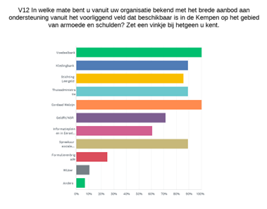 Voorbeelden van organisaties naar welke de vragenlijst is verstuurd zijn de Voedselbanken van de gemeenten, stichting Leergeld Veldhoven en de Kempen, de Adviesraden, CordaadWelzijn etc. De vragenlijst heeft ruim 4 weken opgestaan en uiteindelijk hebben 32 respondenten, goed verspreid over de 5 Kempengemeenten, hem ingevuld.