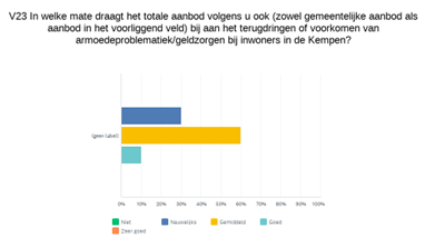 In het voorjaar van 2024 hebben de vier gemeenten een vragenlijst ontwikkeld en deze verspreid onder allerlei samenwerkingspartners (zowel professioneel als vrijwillig) die in hun uitvoeringspraktijk nauw in contact staan met inwoners die te maken hebben met een laag inkomen en/of schulden. De vragenlijst heeft ruim 4 weken open gestaan en uiteindelijk hebben 32 respondenten, goed verspreid over de 4 Kempengemeenten, de vragenlijst ingevuld.