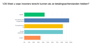 Aan onze respondenten is gevraagd of ze weten waar inwoners terecht kunnen als ze betalingsachterstanden hebben. Hierbij kwam de gemeente als meest bekende aanspreekpunt naar boven en de Sociaal raadslieden en thuisadministratie als tweede. Andere organisaties genoemd zijn budgetcoaches, een bewindvoerder en een dorpsondersteuner.